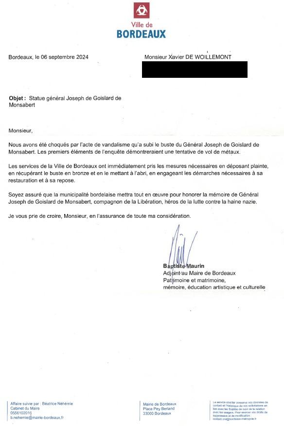 Cet article vous permet de suivre l’évolution de la situation de la statue du général de Monsabert à Bordeaux, qui a été vandalisée en juillet 2024.
